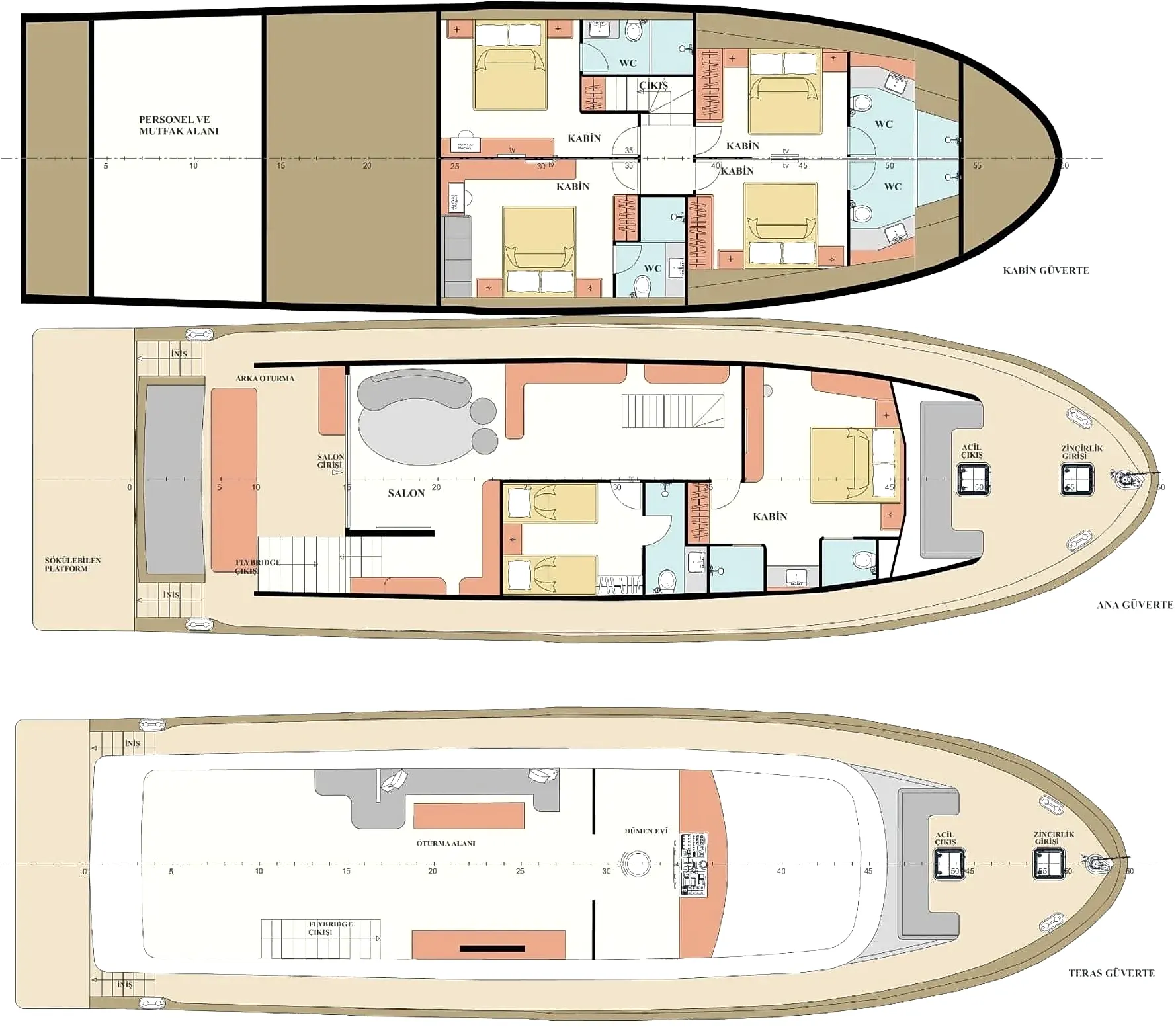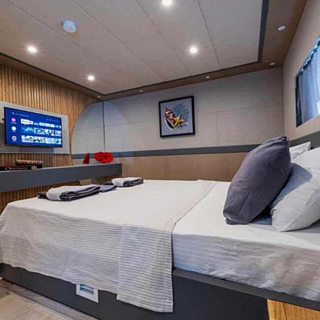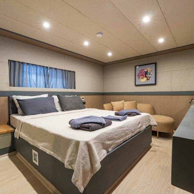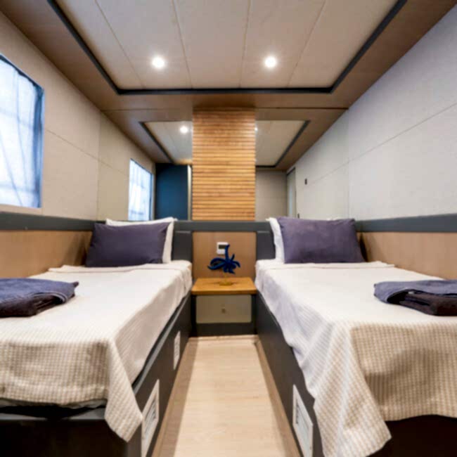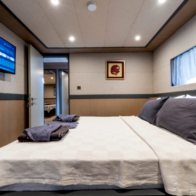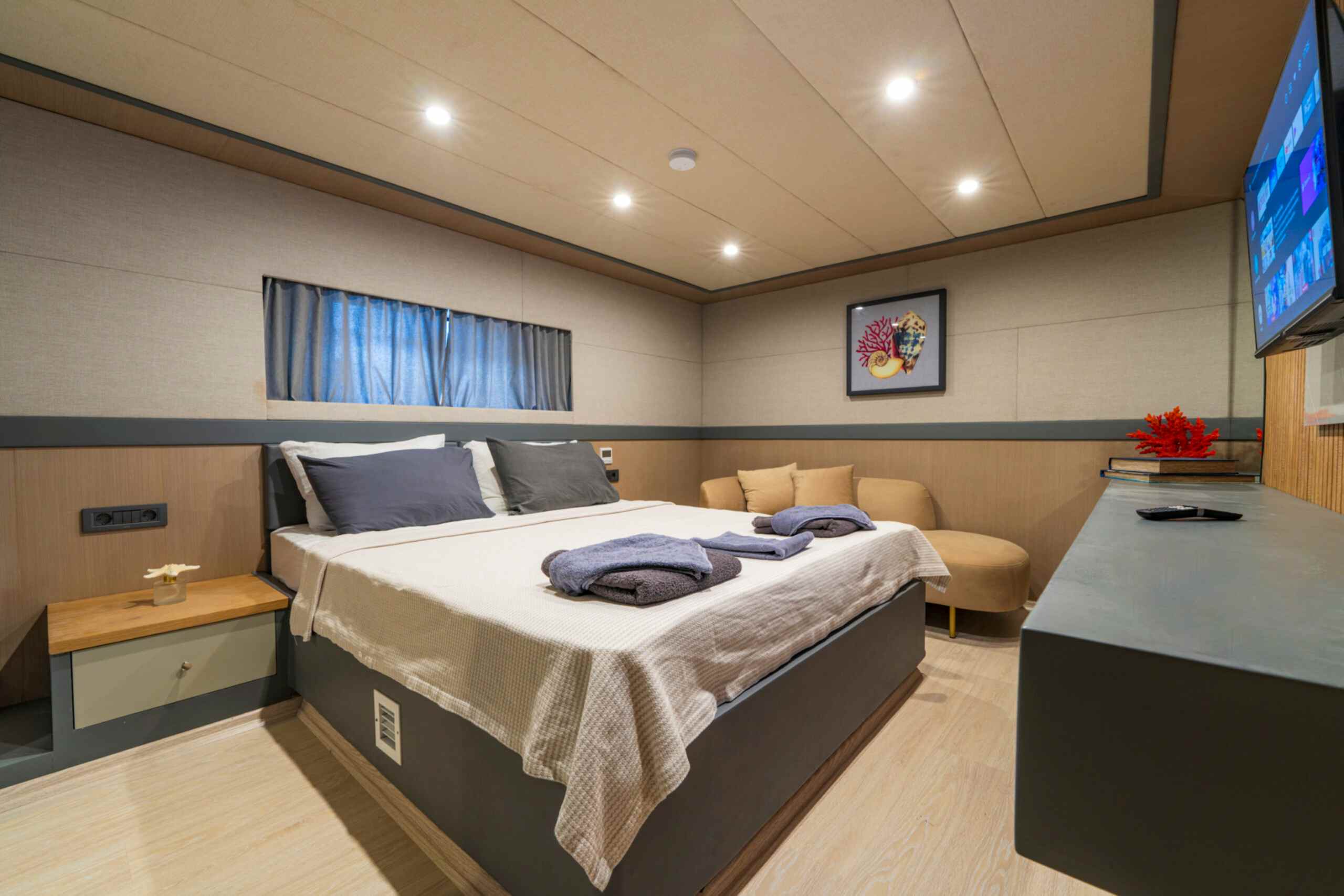 1 master , 4 double ve 1 twin kabini olmak üzere birbirinden şık ve rahat, kendine ait duş, WC ve kliması olan yatımız 6 kamaraya sahiptir.