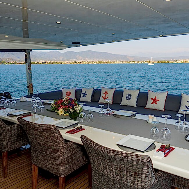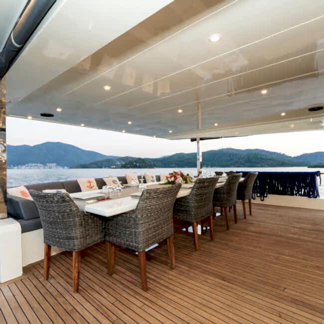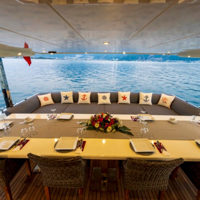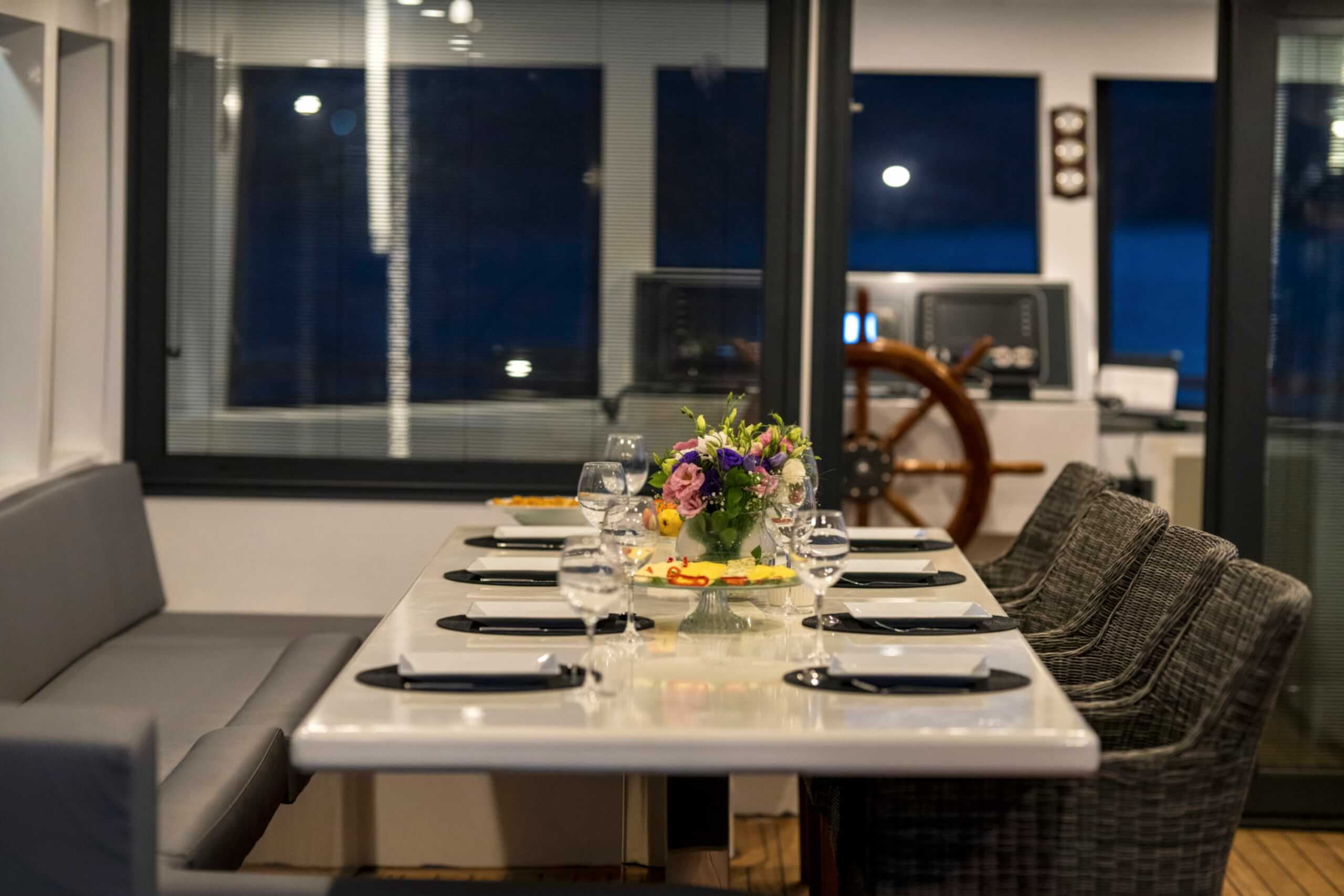 Tam donanımlı mutfağımızda özenle hazırlanan yemeklerimizi güvertede veya salonda bulunan şık masamızda tadabilirsiniz.