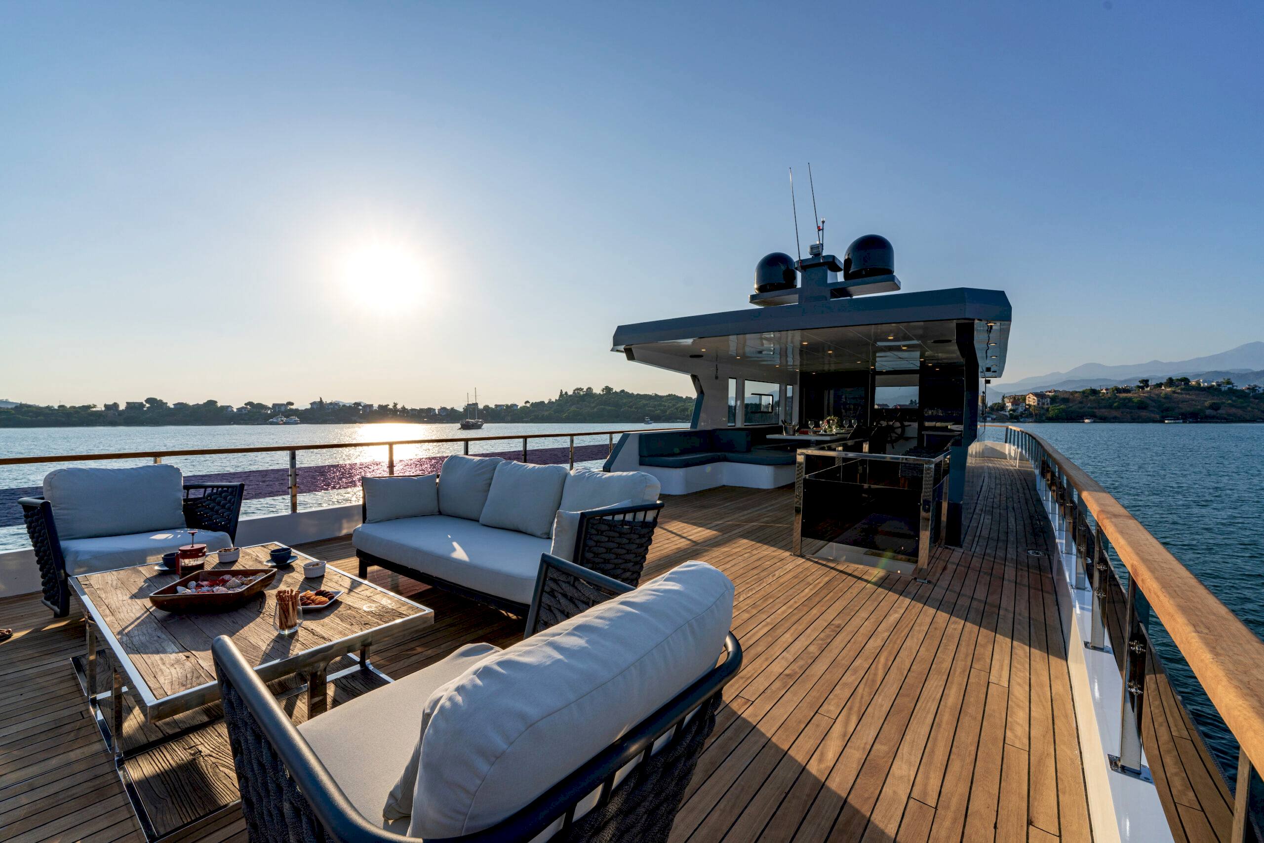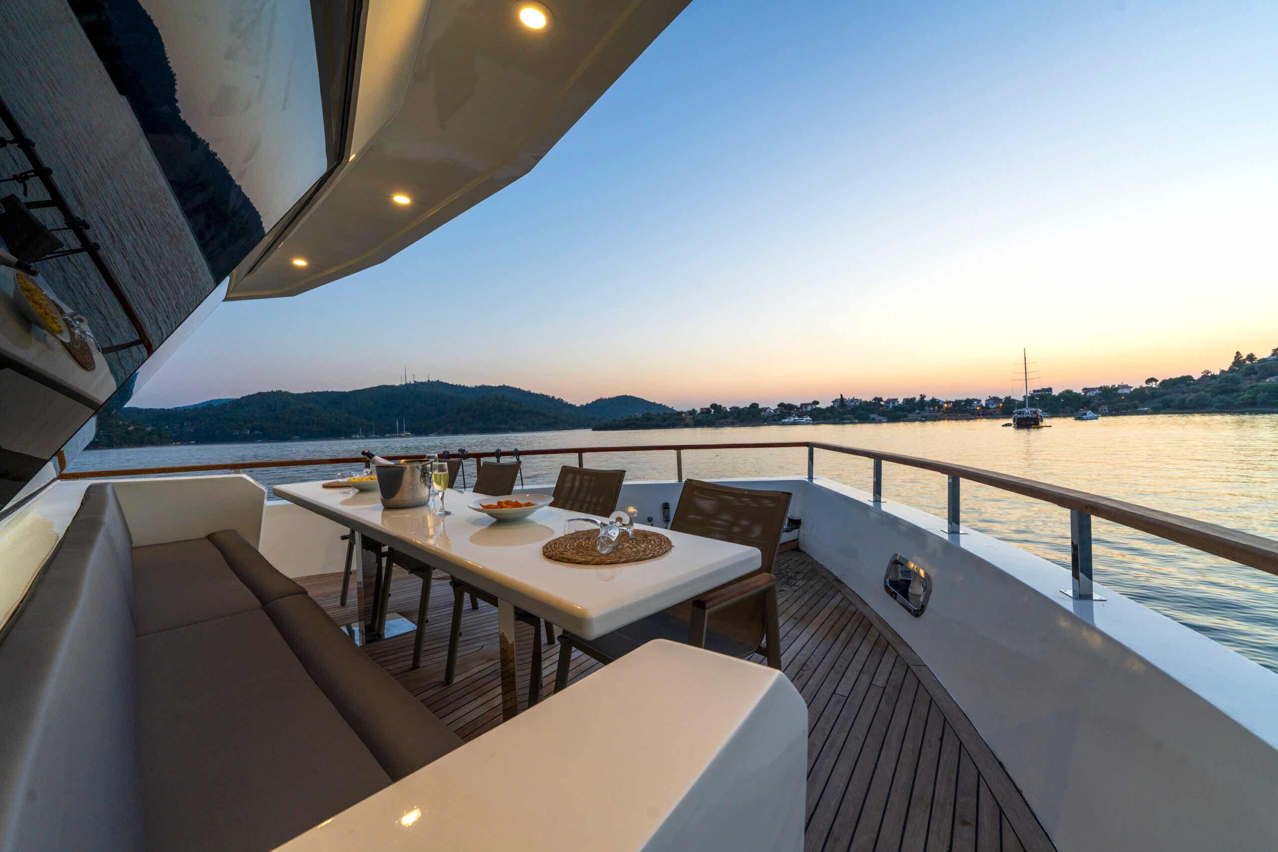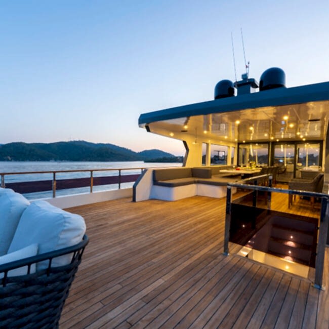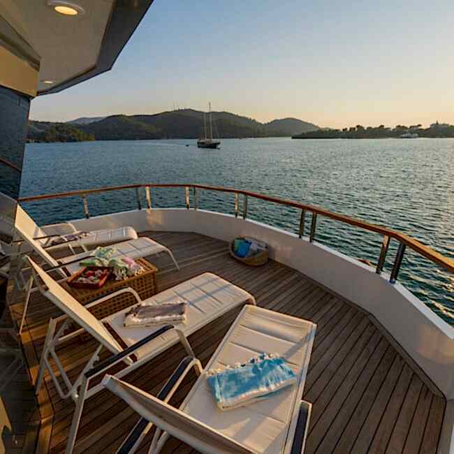 Yatımızın üst tarafında tüm misafirlerimizin güneşlenebileceği geniş ve konforlu güneş yatakları mevcuttur.