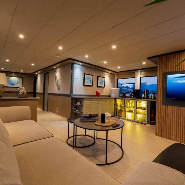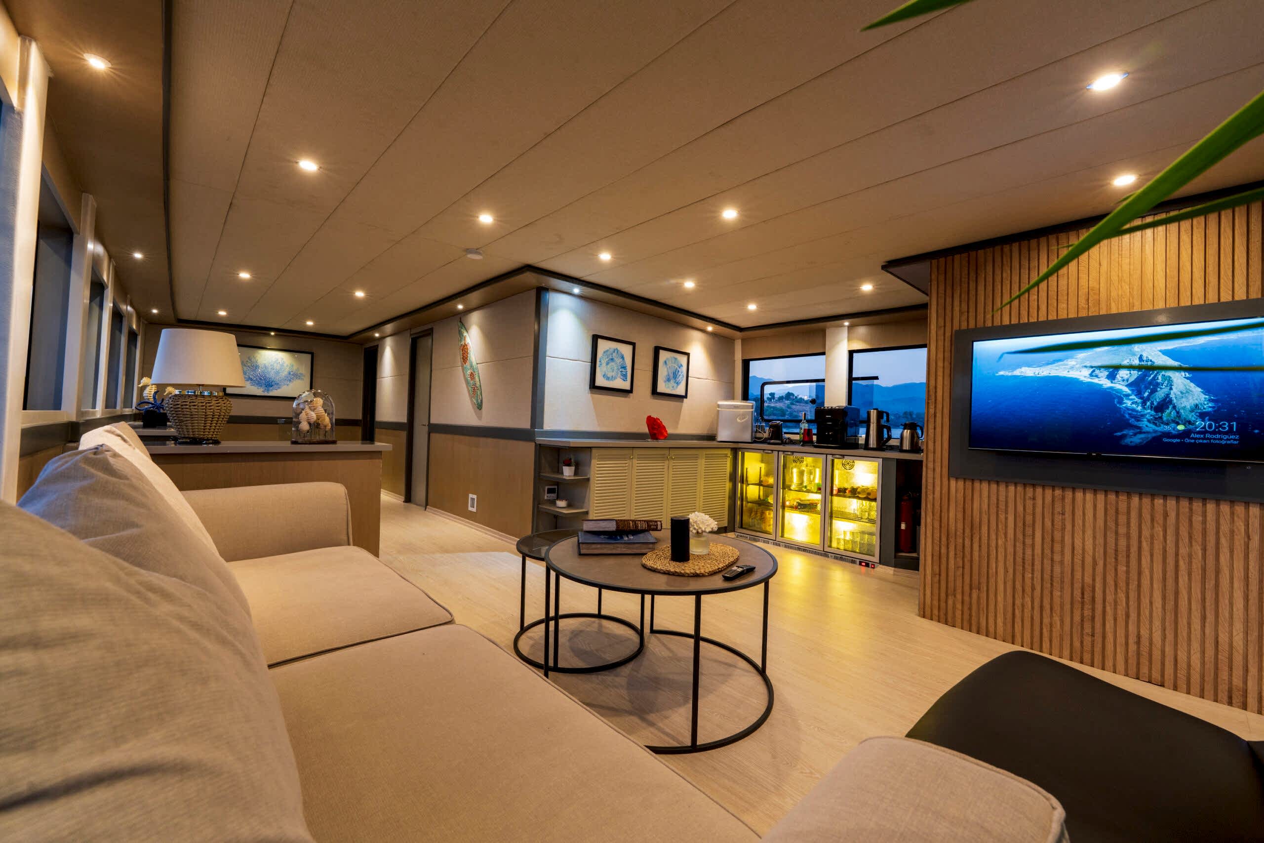 Mürettebat için ayrı yaşam alanları, tam teşekküllü mutfak, açık ve kapalı yemek yeme alanları , dinlenme alanları, ve Amerikan bar mevcuttur.