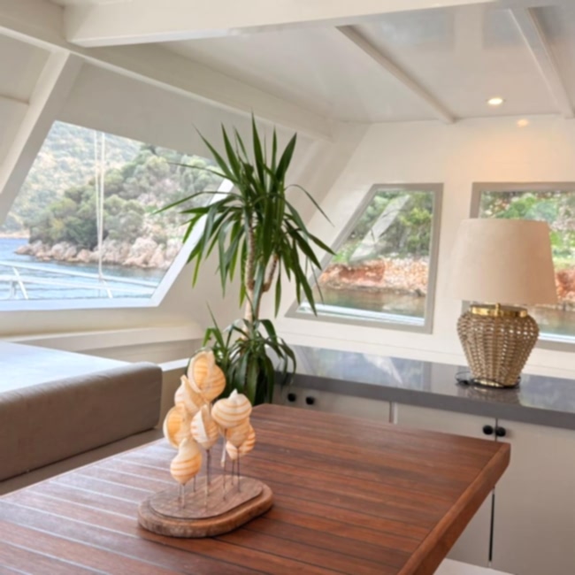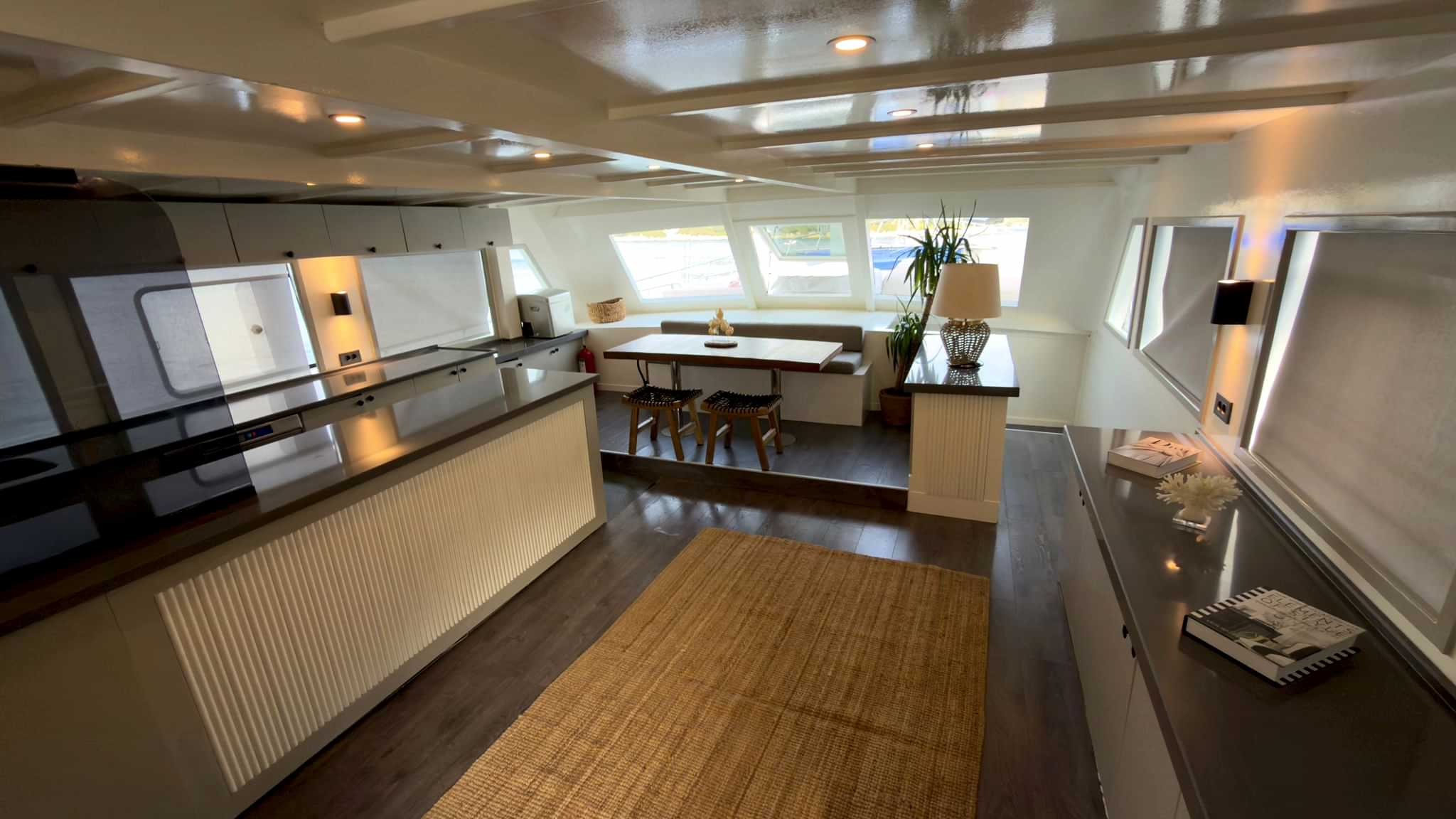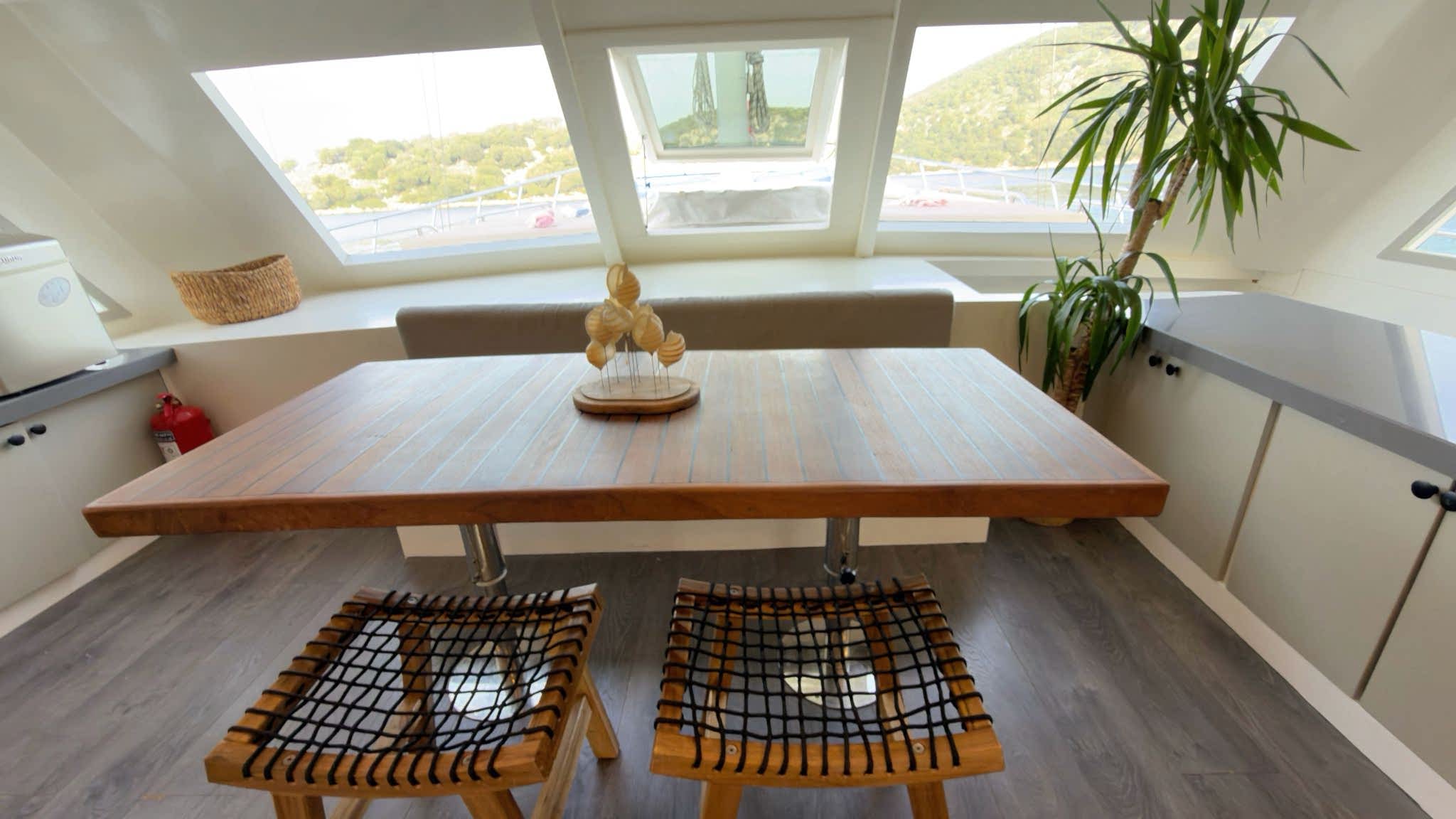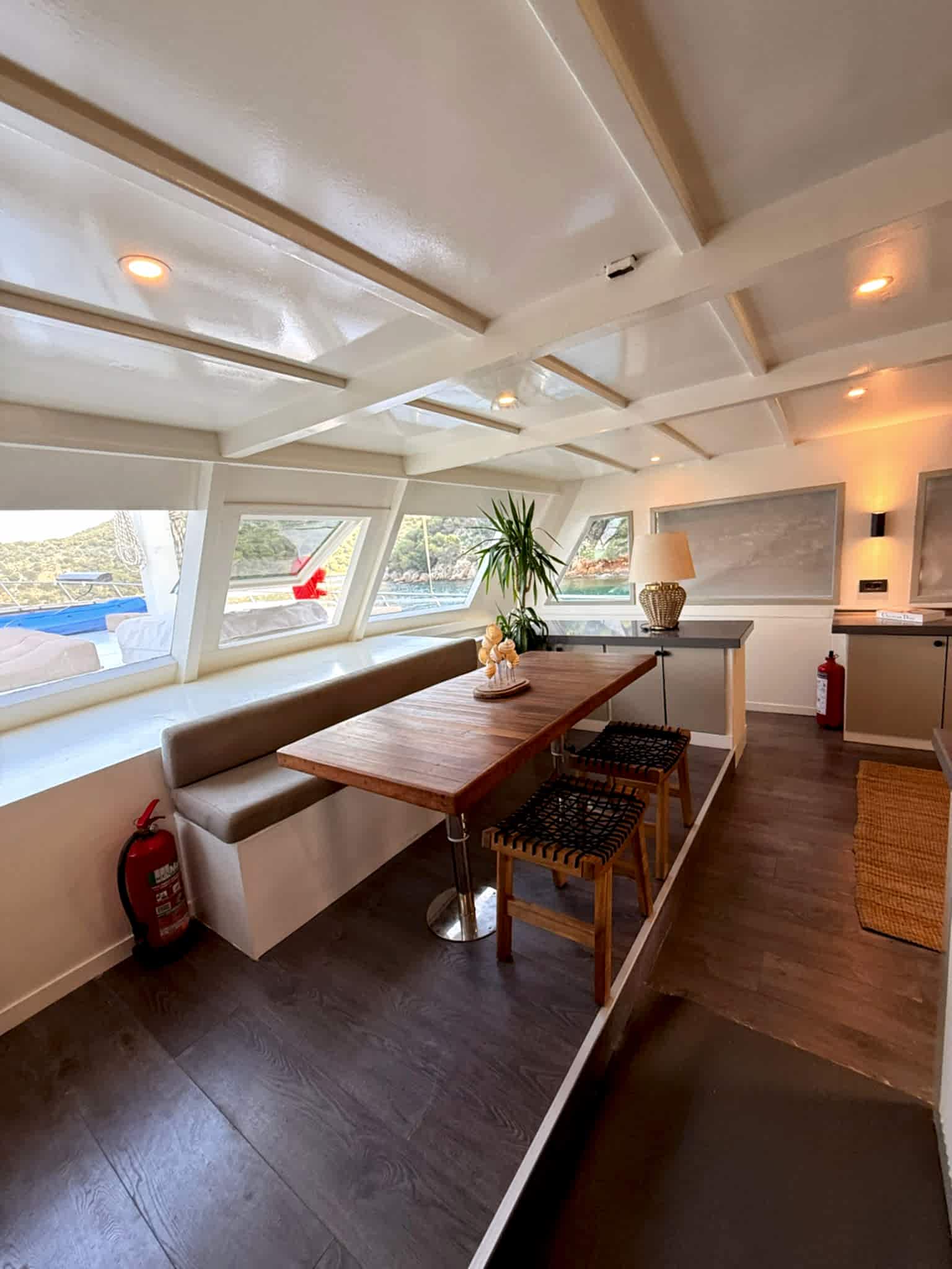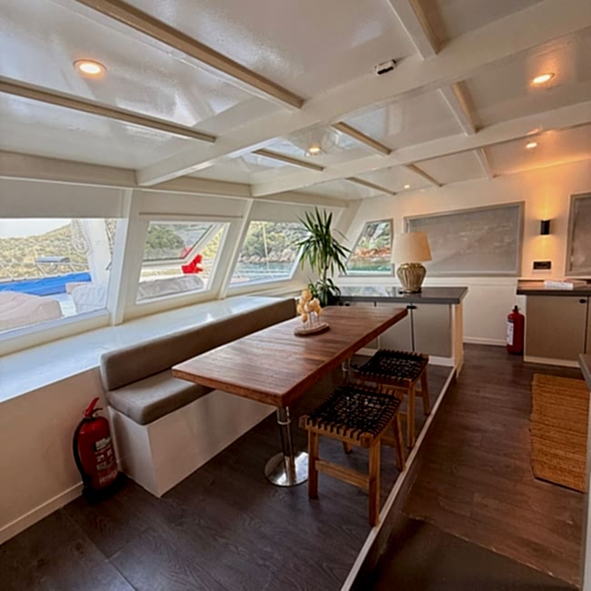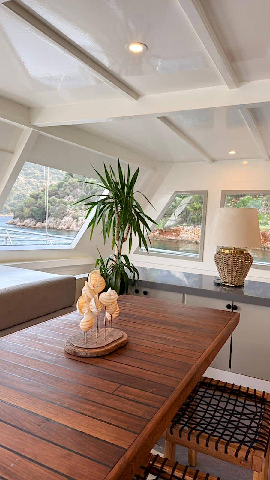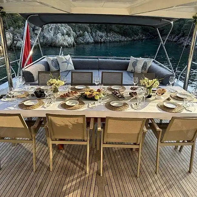 Tam donanımlı mutfağımızda özenle hazırlanan yemeklerimizi güvertede bulunan masamızda tadabilirsiniz.