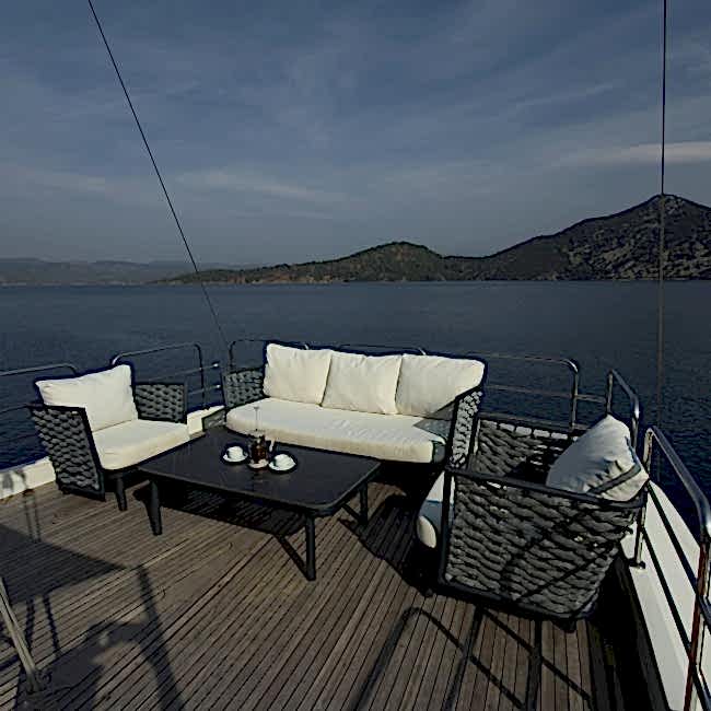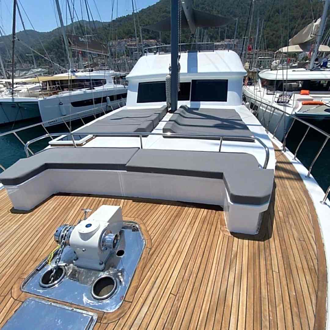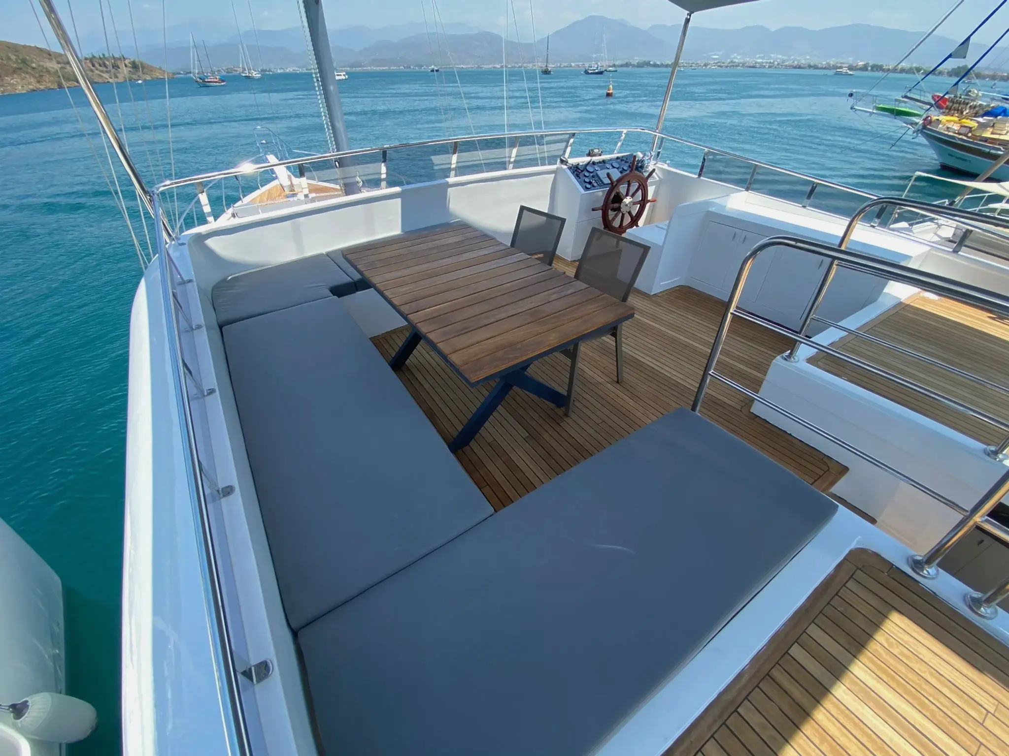 Yatımızın üst tarafında misafirlerimizin güneşlenebileceği şezlonglar, yatımızın ön tarafında ise güneş yatakları mevcuttur.