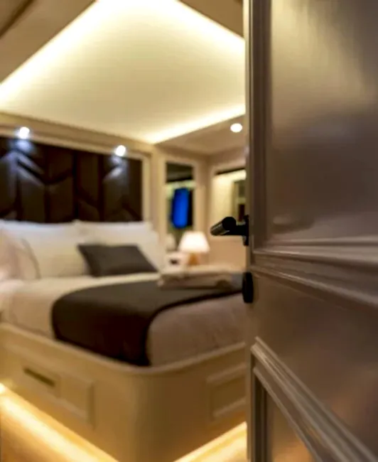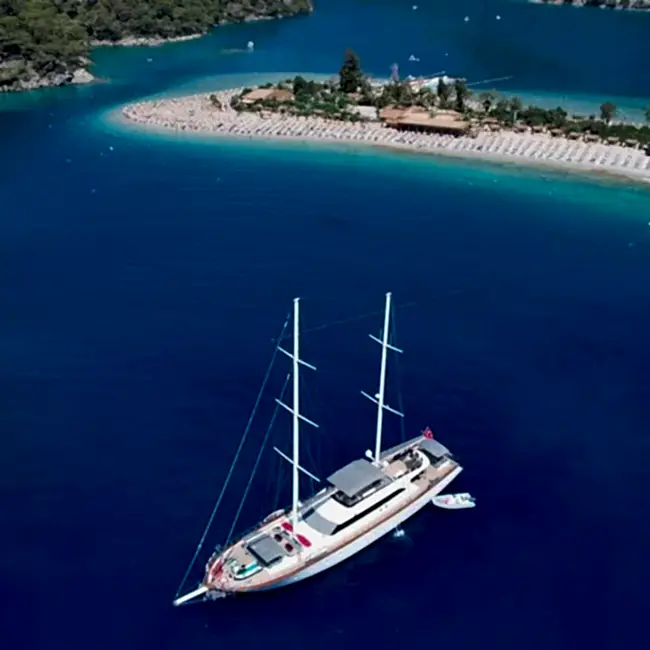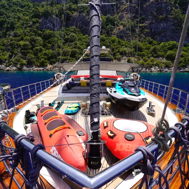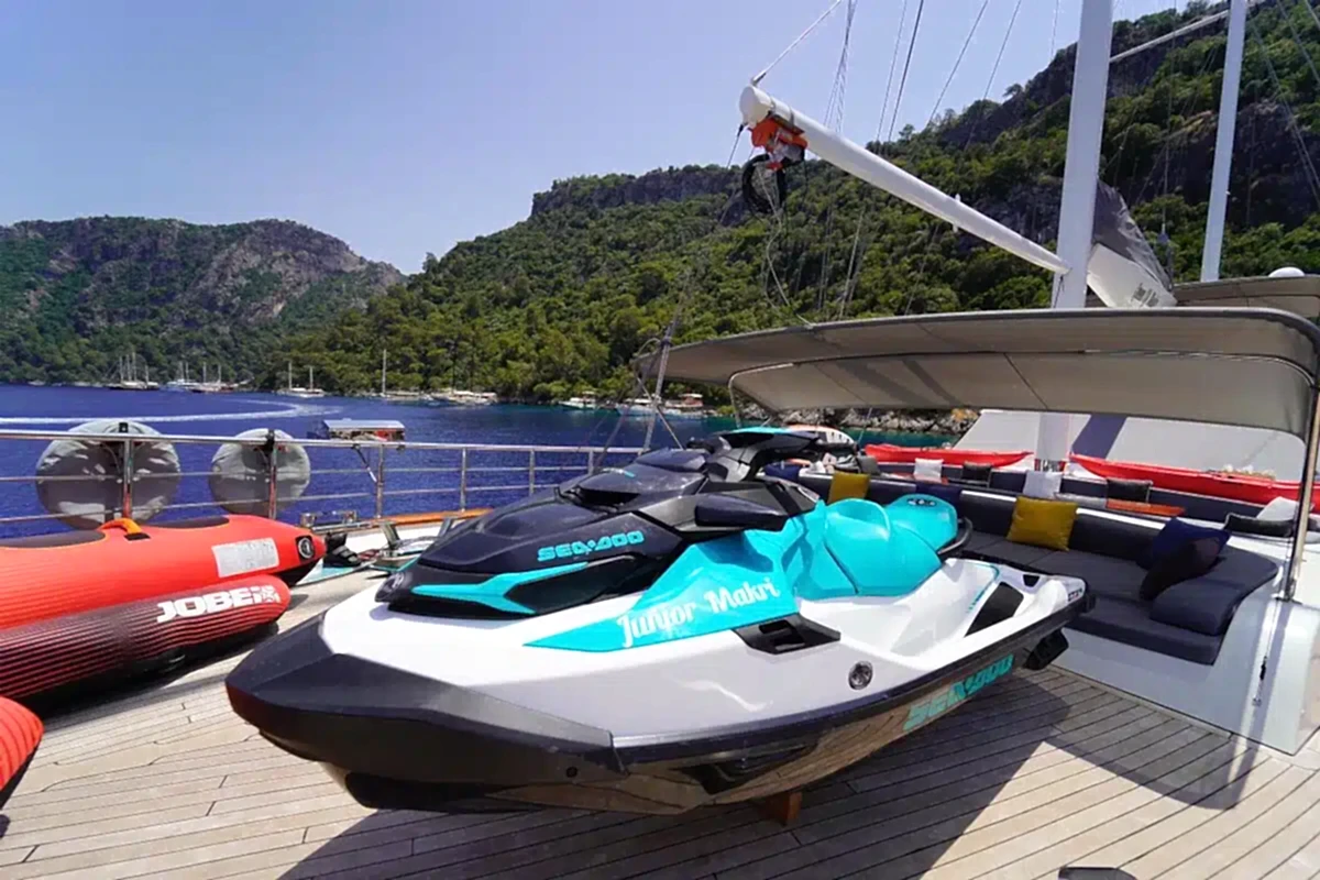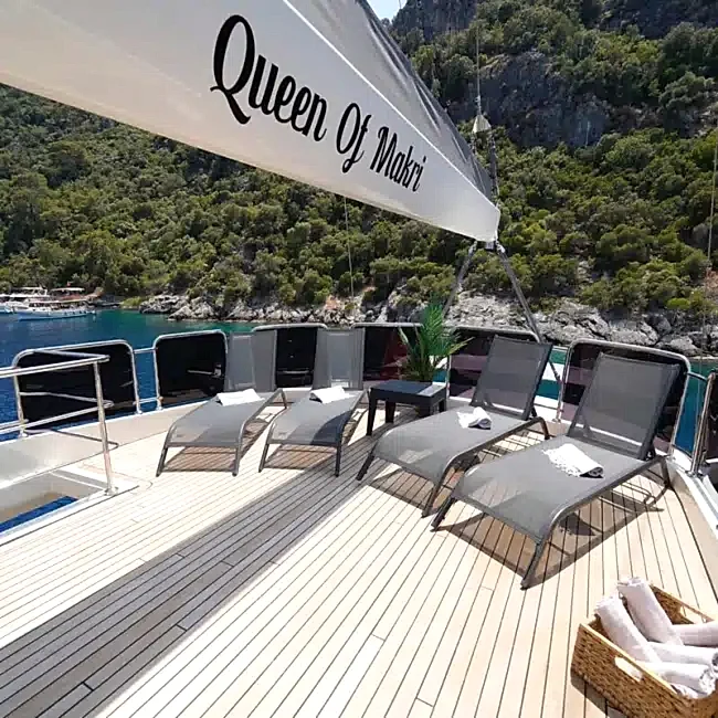 Queen Of Makri konforlu ve şık salonu, çok çeşitli su oyuncakları, jakuzisi ve jet skisiyle sizi muhteşem bir tatil imkanı sağlamaktadır.