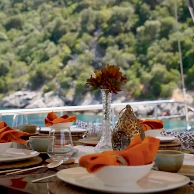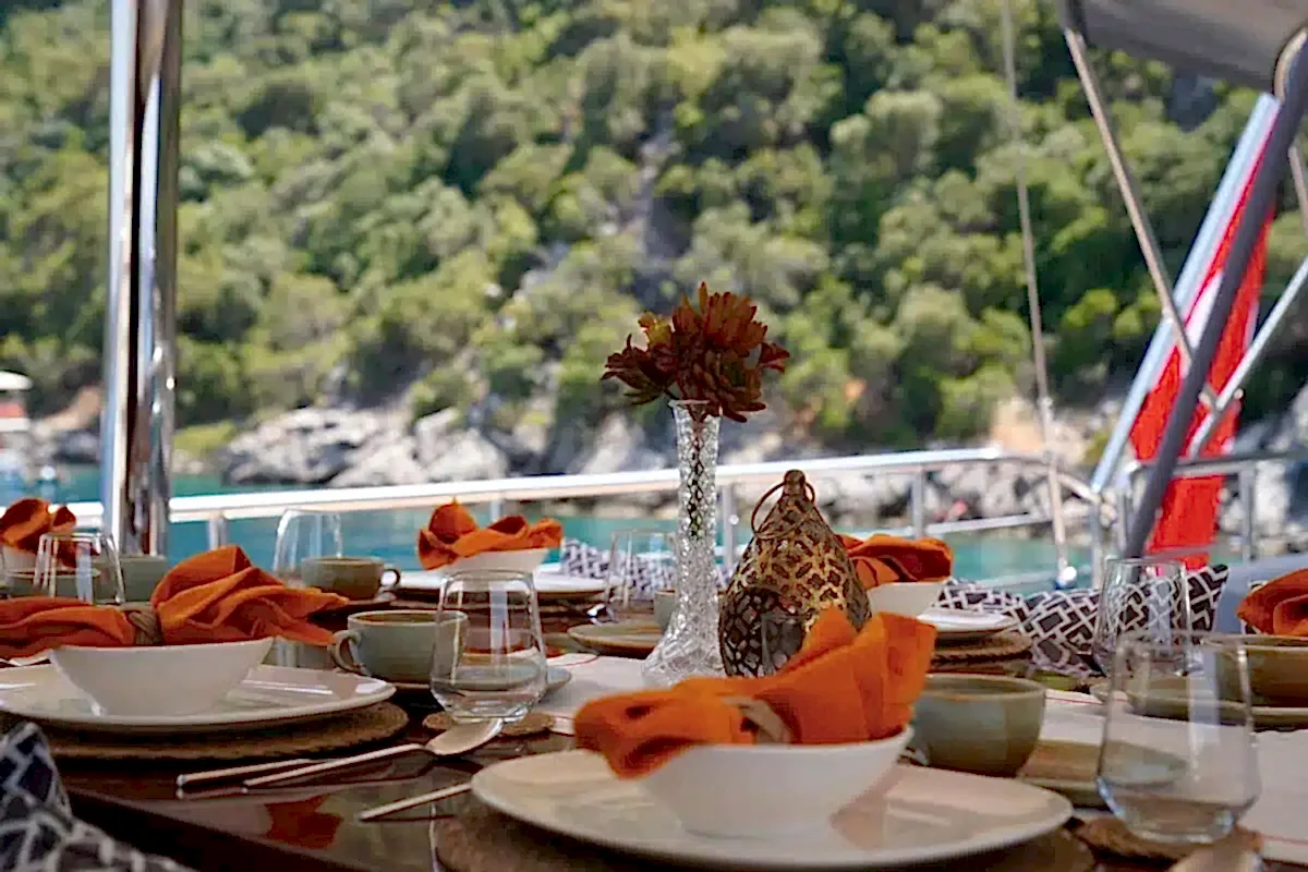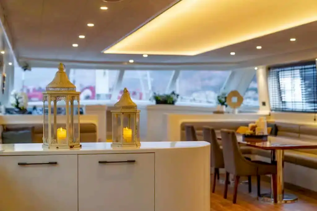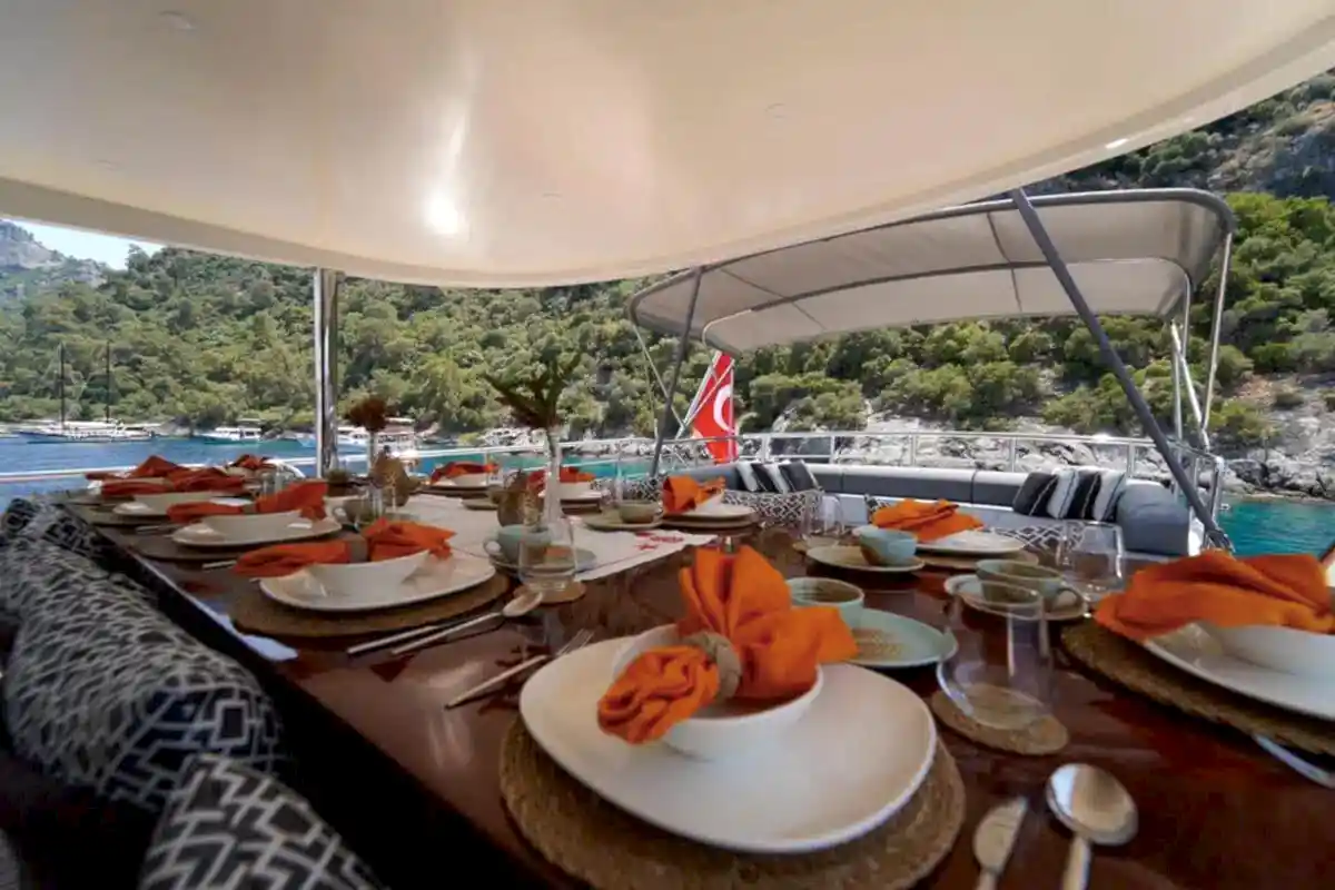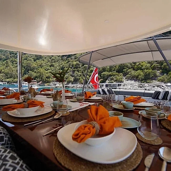 Salonda ve güvertede bulunan yemek masalarına farklı lezzetlerin tadını çıkarabilirsiniz.