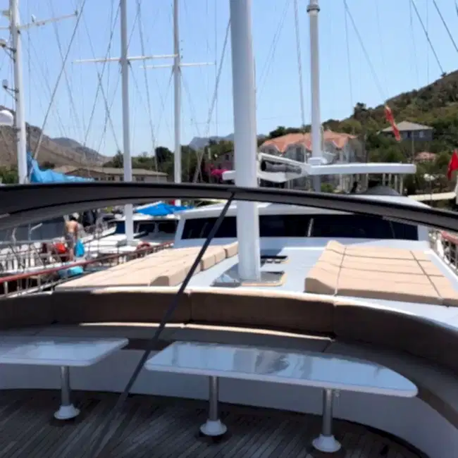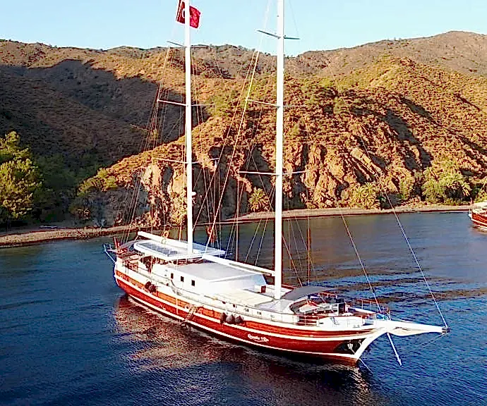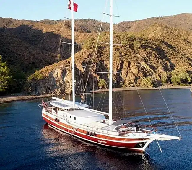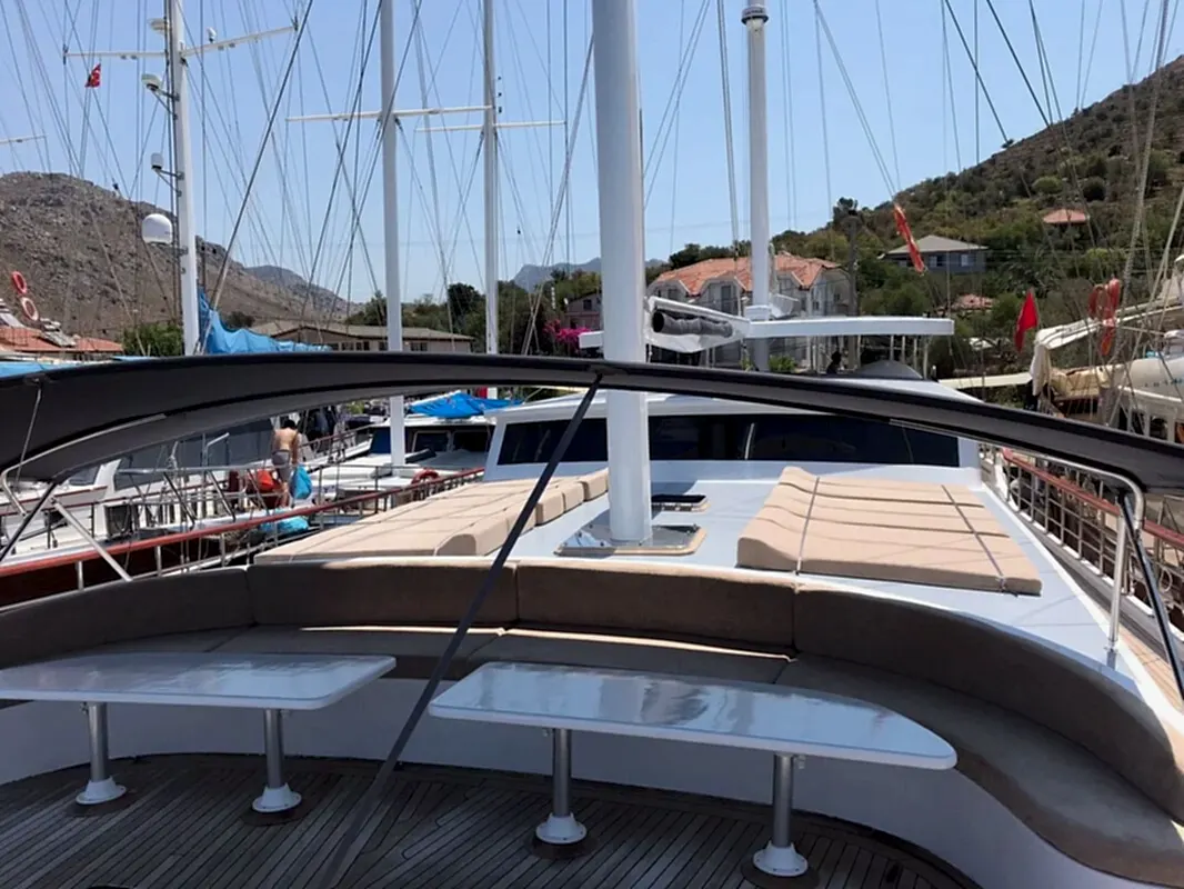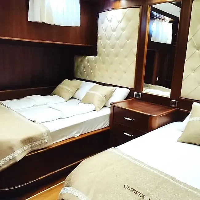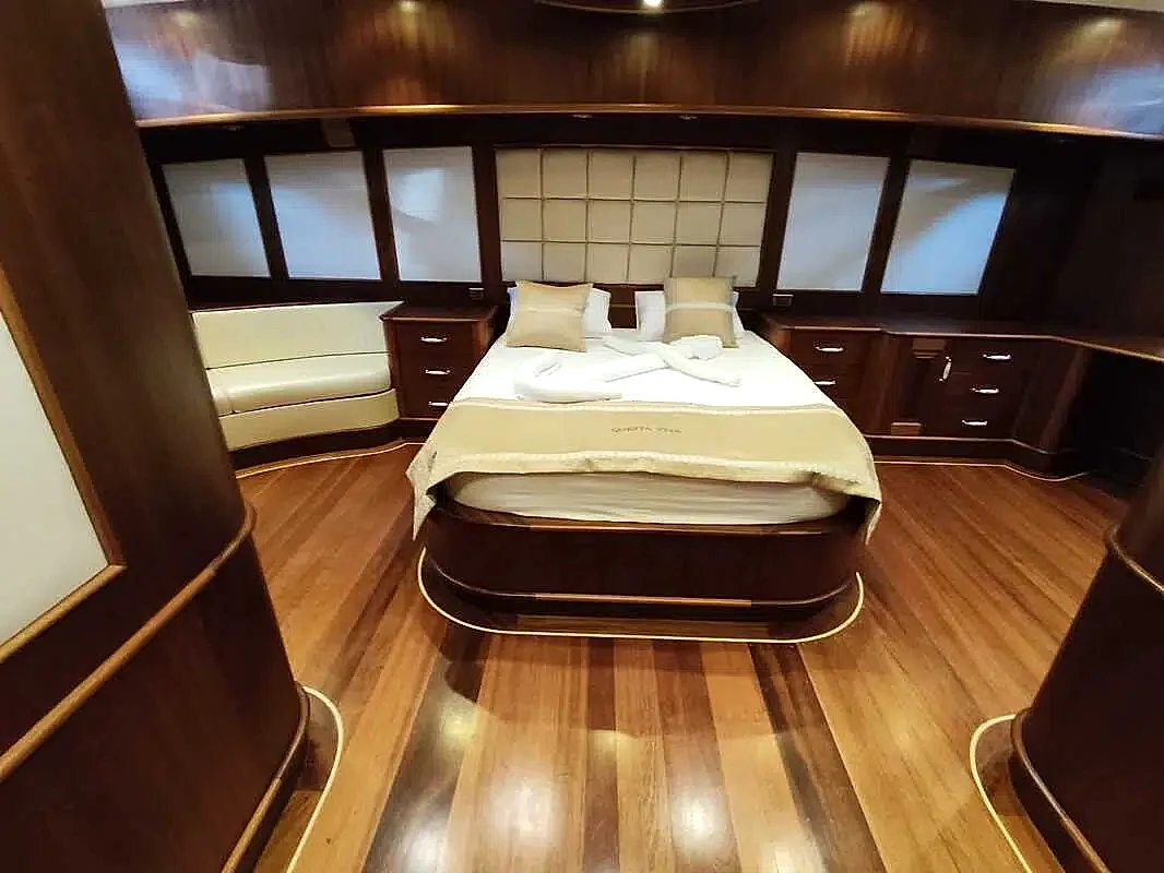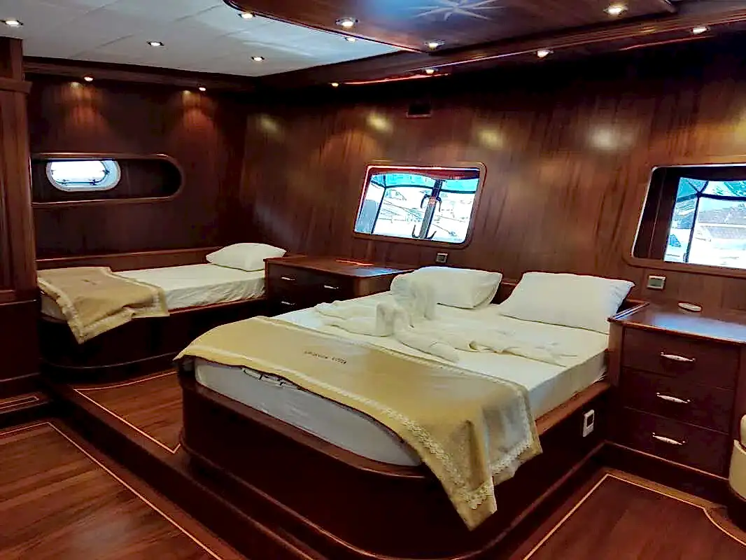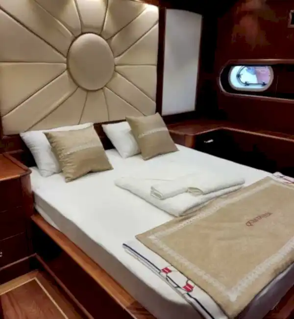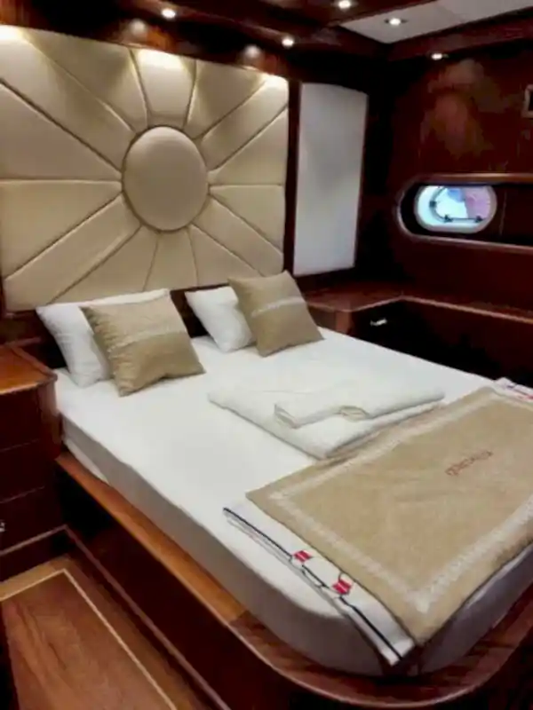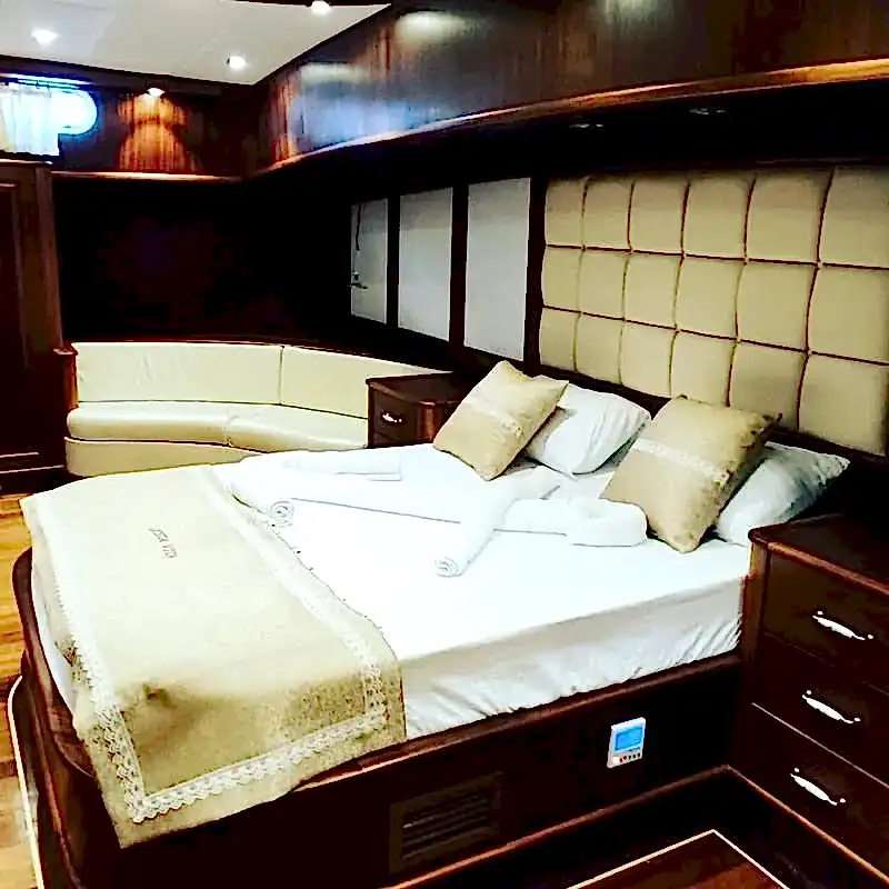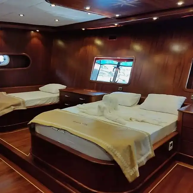 Bu yepyeni gulet 2 master kabin, 2 double yatak odası ve 2 triple kabinden oluşmaktadır ve 12 kişiye kadar konaklama kapasitesine sahiptir. Tüm kabinler ve yaşam alanları klimalıdır. Bu yepyeni tekne 33 metre uzunluğunda ve 8,5 metre genişliğindedir. Yat oldukça geniştir ve oldukça konforlu yaşam alanlarına sahiptir.