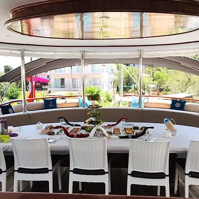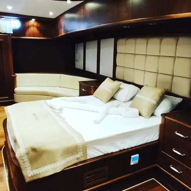 Kabinlerin içi oldukça konforlu ve şık döşenmiş olup, konfor için her detay düşünülmüştür. 5 kişilik mürettebat son derece profesyonel ve bu mavi yolculuk sırasında hiçbir eksiğiniz kalmayacak.