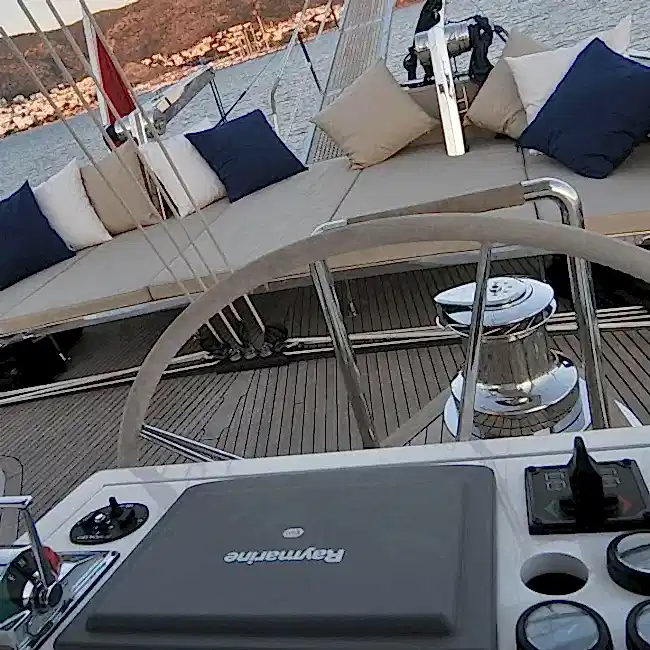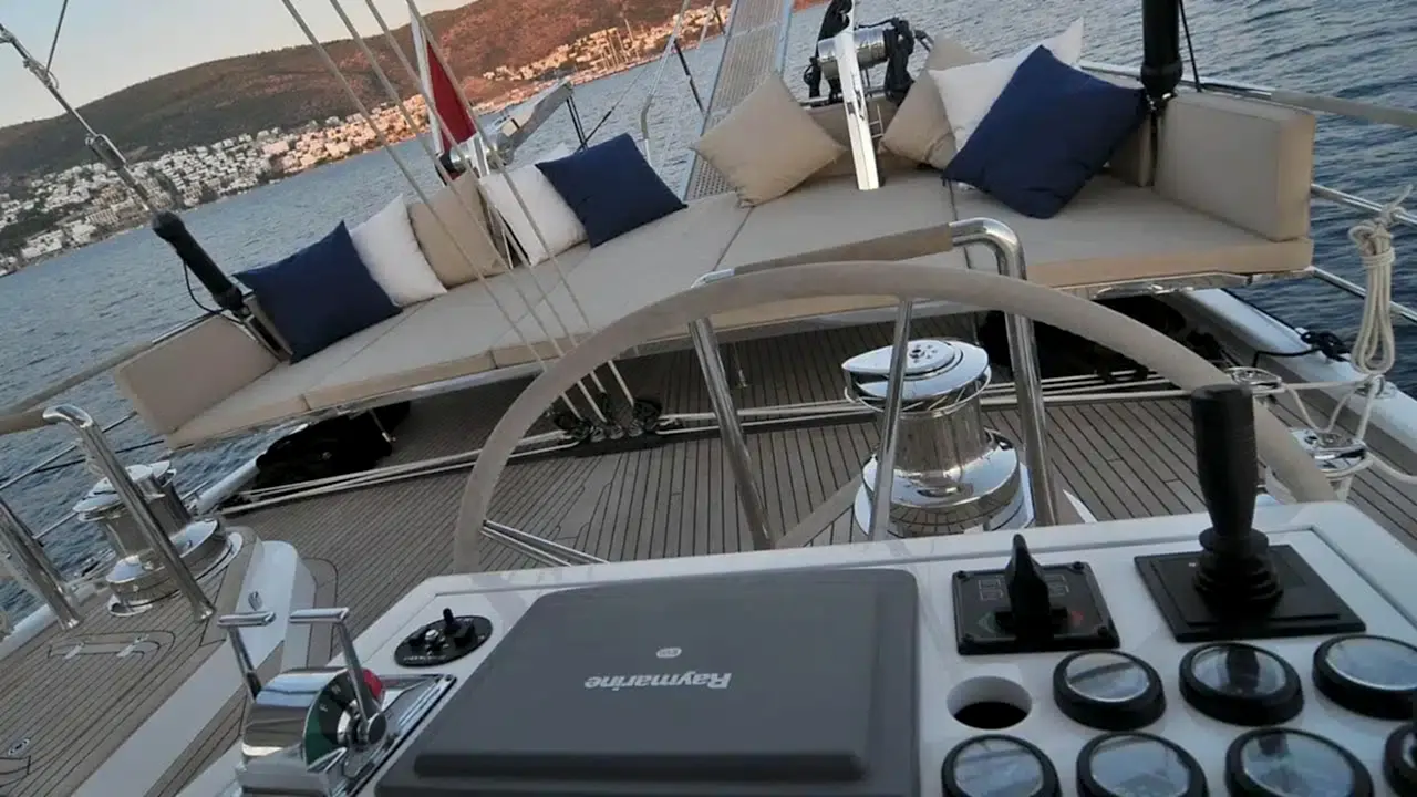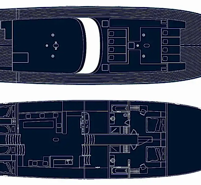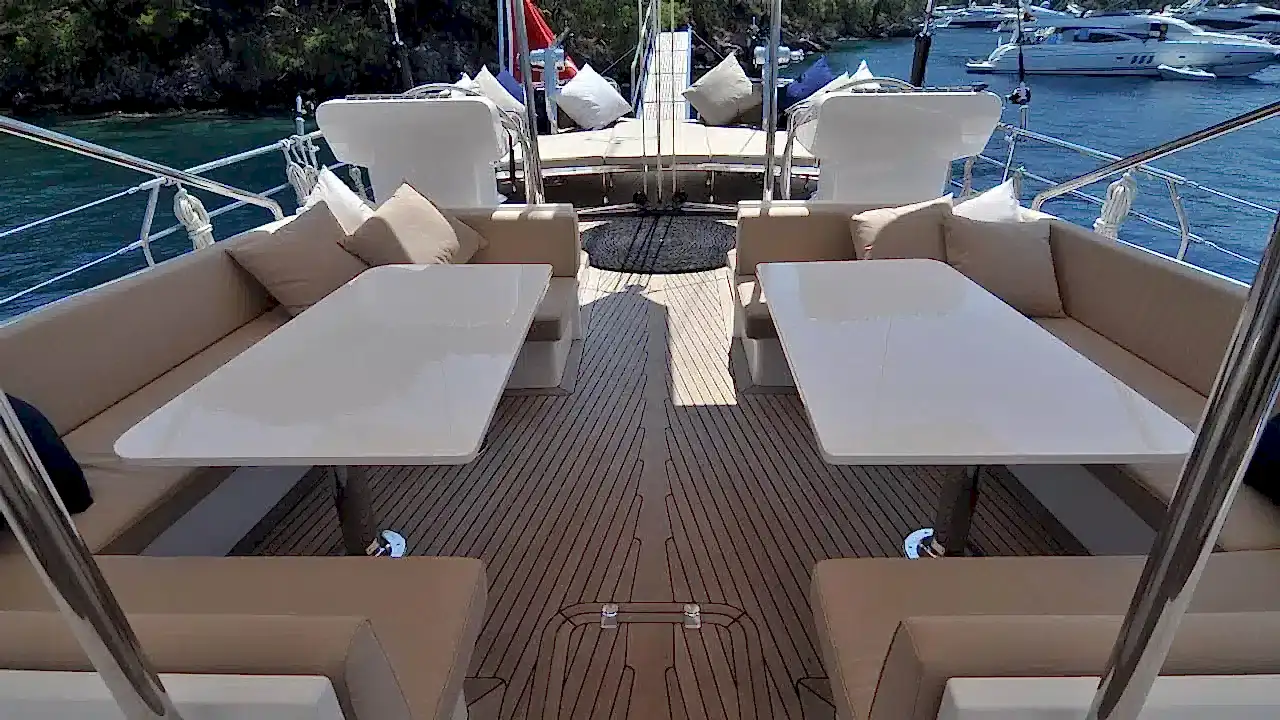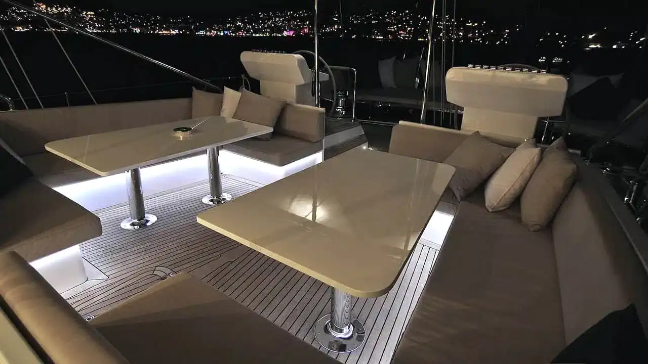 Güvertede 2 dış direksiyon pozisyonu mevcuttur. Arka güverte iki büyük salon güneş alanından, 2 masa ve oturma alanından oluşan bir açık hava yemek odasından, bir ıslak bardan, ses sisteminden ve televizyondan oluşur. Açık gölgeli bir alan sunan geniş peyzajlı köprüyü kaplayan sabit bir tente de vardır.